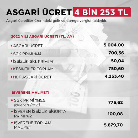2022 Yılı Asgari ücretini açıklayan Cumhurbaşkanı Erdoğan; “Bilindiği gibi asgari ücret her yıl çalışan ve işveren kesimlerinin iştirakiyle belirlenmektedir. Bugün 4. toplantıda nihai karar aşamasına gelinmiştir. Taraflar özveri ile bu süreci işlettiler. Bundan dolayı Cumhurbaşkanı olarak ben de çok mutluyum. Asgari ücreti 4 bin 250 lira olarak belirledik. Asgari ücretteki artış yüzde 50 seviyesinde gerçekleşti.” diye konuştu.