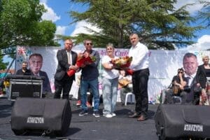 Konser sonunda Saray Belediye Başkanı Abdül Taşyasan, Küçükyoncalı Muhtarı İrfan Gündüz ile birlikte Karlos Murat’a teşekkür ederek çiçek takdim etti.