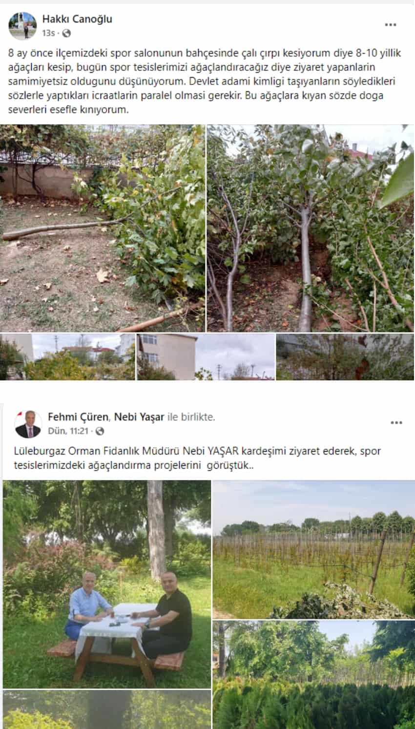 CHP Saray İlçe Başkan Yardımcısı Hakkı Canoğlu, Saray İlçe Gençlik ve Spor müdürü Fehmi Çüren’in sosyal medyadan paylaştığı “Lüleburgaz Orman ve Fidanlık Müdürü Nebi Yaşar kardeşimizi ziyaret ederek, spor tesislerimizde ki ağaçlandırma projelerini görüştük” paylaşımına isim vermeden atıfta bulunarak sosyal medya hesabından “8 ay önce ilçemizdeki spor salonunun bahçesinde çalı çırpı kesiyorum diye 8-10 yıllık ağaçları kesip, bugün spor tesislerimizi ağaçlandıracağız diye ziyaret yapanların samimiyetsiz olduğunu düşünüyorum. Devlet adamı kimliği taşıyanların söyledikleri sözlerle yaptıkları icraatların paralel olması gerekir. Bu ağaçlara kıyan sözde doğaseverleri esefle kınıyorum” diye paylaşım yaparak tepki gösterdi.