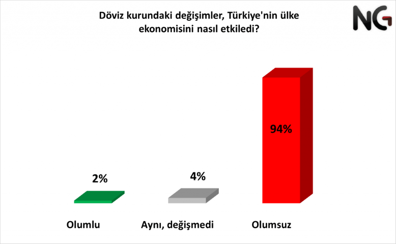 Döviz artışlarının, ülkemiz üzerinde ekonomik olarak nasıl bir etki oluşturduğunu halkımıza sorduk. Katılımcıların %94’ü ülkemizin ekonomisinin olumsuz etkilendiğini, %4’ü ülkemizin ekonomik olarak etkilenmediğini belirtti. Kalan %2 ise ekonomimizi olumlu olarak etkilediği görüşünde.