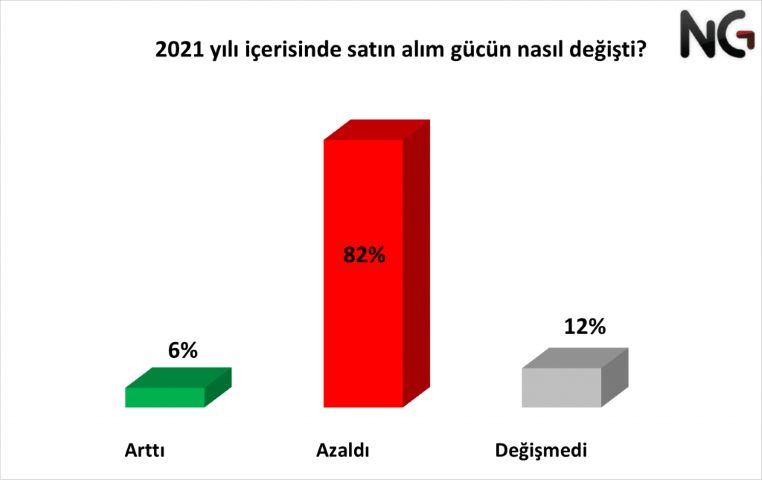 Yaptığımız araştırmada vatandaşa 2021 yılındaki alım gücünün nasıl değiştiğini sorduk. Katılımcıların %82’si alım gücünün düştüğünü belirtirken, %12’si değişmediğini belirtti. Alım gücünün arttığını belirtenlerin oranı ise yalnızca %6.