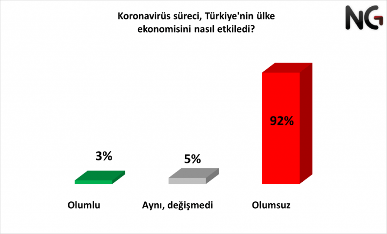 Kovid-19’un ülkemizin ekonomisi üzerinde nasıl bir etki oluşturduğunu sorduk. Katılımcıların %92’si ülkemizin ekonomisinin olumsuz etkilendiğini, %5’i koronavirüsden ülkemizin ekonomik olarak etkilenmediğini belirtti. Kalan %3 ise ekonomimizi olumlu olarak etkilediği görüşünde.